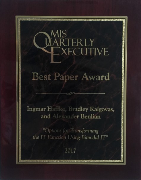 Ingmar Haffke, Bradley Kalgovas and Prof. Dr. Alexander Benlian were awarded the Best Paper Award 2017 at the International Conference on Information Systems (ICIS) 2018 in San Francisco for their article “Options for Transforming the IT Function Using Bimodal IT”, published in the journal MIS Quarterly Executive.