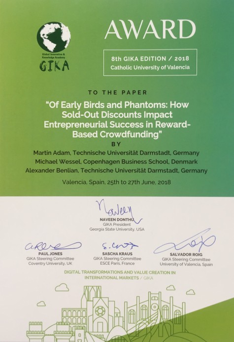 The award was given for the co-authored article “Of Early Birds and Phantoms: How Sold-Out Discounts Impact Entrepreneurial Success in Reward-Based Crowdfunding” for the planned Special Issue “Digital Innovation and Venturing” at the 2018 Global Innovation and Knowledge (GIKA) Conference in Valencia.